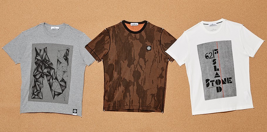 (왼쪽부터) 이번 시즌 선보인 ‘더 레터 시리즈’ 중 하나로 입체적으로 재구성된 알파벳 ‘N’을 전면에 새긴 회색 티셔츠 15만5천40원·브랜드 특유의 카무플라주를 갈색과 오렌지 색상으로 표현한 티셔츠 20만6천7백20원·알파벳 ‘O’를 중심으로 브랜드명을 교차해 프린트한 흰색 티셔츠 가격미정 모두 스톤 아일랜드 제품.