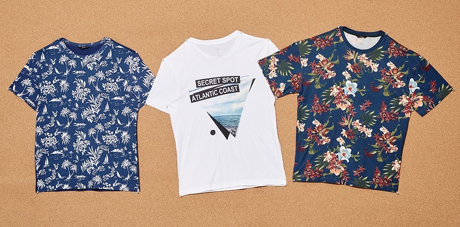 (왼쪽부터) 밝은 청색을 해변 삼아 야자수, 요트, 파도 등 이국적인 프린트를 담아낸 티셔츠·시원한 애틀랜틱 해변 풍경을 역삼각 형태로 담은 흰색 티셔츠·트로피컬 프린팅의 밝은 감색 티셔츠 각각 3만5천원 모두 지오지아 제품.