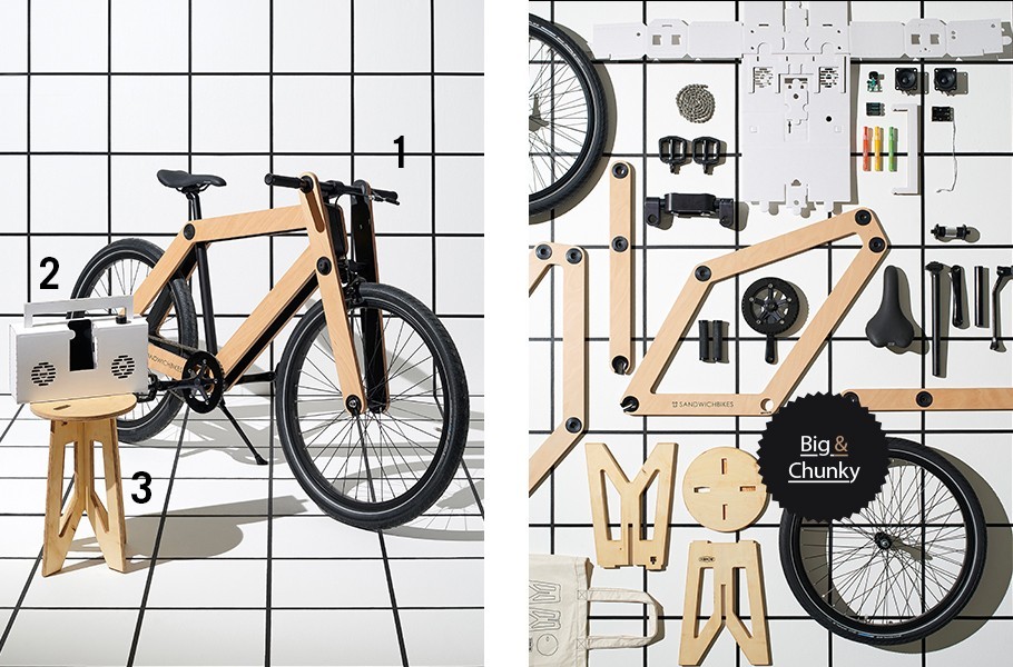 샌드위치 목제 패널로 이뤄진 본체를 바탕으로 페달, 바퀴 등등 모든 부품이 질서정연하게 구성되어 있다. 50개가 채 안되는 부품으로 자전거 한 대를 비교적 간단하고 쉽게 만들 수 있다.