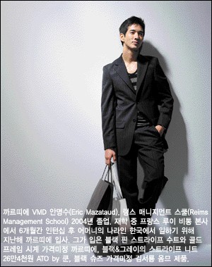 젊고 성공한 독창적인 사람을 뜻하는 블랙칼라 워커는 <아레나>가 지향하는 남성의 표본이라 할 수 있다. 그들은 문화에 관심이 많으며 열정적으로 향유하고자 한다. 무조건 돈을 많이 버는 사람이 아닌 새롭고 쿨한 직업을 가지고 있으며, 스스로의 가치를 표현하길 원한다. 따라서 패션 아이템 하나를 고를 때도 자신의 취향을 고려해 쇼핑하는 감각적인 남성이다. 이러한 블랙칼라 워커에 부합되는 소비층이 최근 (주)프로패션정보네크워크에 의해 발표되었다. 샘(SAM)족이라 불리는 이들은 소득을 스스로에게 투자해 경제적으로나 정신적으로 풍요로운 생활을 누리고자 한다. 대학 졸업 후 직장생활을 통해 일정한 소득을 올리고 있으며, 패션뿐만 아니라 미용, 문화생활 전반에 투자를 아끼지 않는다. 또 직장을 선택하는 기준에 있어서도 블랙칼라 워커처럼, 돈만을 위한 것이 아닌 얼마나 즐기면서 일할 수 있는지를 주목한다. 하지만 이들은 외모와 인생을 즐기는 데에만 혈안이 되어 있지는 않다. 직장일 외에도 스스로의 능력 계발을 위한 노력을 꾸준히 하고 있으며, 자신의 미래를 위해 준비하고 있다. 샘족을 대표할 수 있는 인물을 찾던 중 까르띠에에서 VMD(비주얼 머천다이징의 약자로 논리적이고 체계적으로 상품을 디스플레이하는 역할을 당담한다)를 하고 있는 에릭(한국 이름 안명수)을 만날 수 있었다. 그를 통해 샘족의 라이프스타일을 엿보도록 하자.