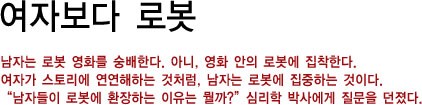 남자는 로봇 영화를 숭배한다. 아니, 영화 안의 로봇에 집착한다. 여자가 스토리에 연연해하는 것처럼,남자는 로봇에 집중하는 것이다.“남자들이 로봇에 환장하는 이유는 뭘까?”심리학 박사에게 질문을 던졌다.<br><br>[2008년 8월호]