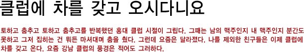 토하고 춤추고 토하고 춤추고를 반복했던 홍대 클럽 시절이 그립다. 그때는 남의 맥주인지 내 맥주인지 분간도 못하고 그저 집히는 건 뭐든 마셔대며 춤을 췄다. 그런데 요즘은 달라졌다. 나를 제외한 친구들은 이제 클럽에 차를 갖고 온다. 요즘 강남 클럽의 풍경은 적어도 그러하다. <br><br>[2008년 8월호]