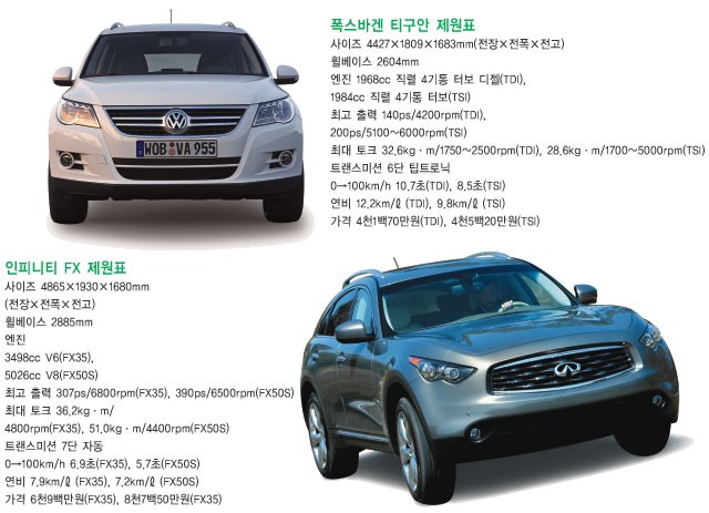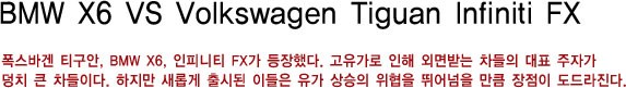 폭스바겐 티구안, BMW X6, 인피니티 FX가 등장했다. 고유가로 인해 외면받는 차들의 대표 주자가 덩치 큰 차들이다. 하지만 새롭게 출시된 이들은유가 상승의 위협을 뛰어넘을 만큼 장점이 도드라진다.<br><br>[2008년 8월호]
