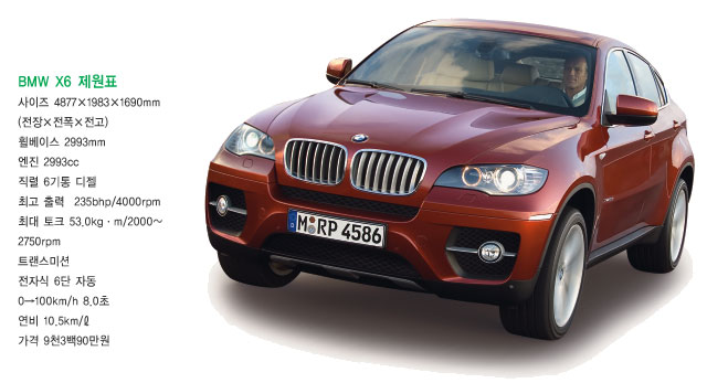 BMW X6는 위에 언급한 차들처럼 주차를 도와주진 않는다. 하지만 신개념 차이기에 최초로 선보이는 기술이 눈에 띈다. BMW X6는 도로 상황에 따라 앞뒤 구동력을 0~100 또는 100~0까지 자동으로 변환해주는 인텔리전트 사륜 구동 시스템 ‘xDrive’에, 뒷바퀴 동력도 좌우로 조절할 수 있는 다이내믹 퍼포먼스 컨트롤 기능이 처음 적용됐다. 다이내믹 컨트롤은 급격한 핸들링이나 급커브 시에도 주행 도로의 노면, 코너 각도, 속도에 따라 변함없이 민첩한 성능을 발휘하게 도와주는 기능이다. 가속뿐 아니라 감속 시에도 작동돼 안전 운전을 돕는다. 스포츠 액티비티 쿠페라는 이름을 드리우고 나타난 X6는 X패밀리 모델의 유전자는 그대로 계승하면서 6시리즈 쿠페의 스포티하고 우아한 실루엣을 동시에 표현해냈다. X6는 측면에서 보면 존재 목적을 노골적으로 노출한다. 윈도 디자인, 루프 라인, 차체 라인 등 모든 부분이 속도감을 표현하고 있기 때문이다.