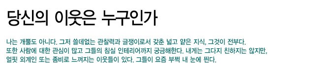 나는 개뿔도 아니다. 그저 쓸데없는 관찰력과 글쟁이로서 갖춘 넓고 얕은 지식, 그것이 전부다. 또한 사람에 대한 관심이 많고 그들의 침실 인테리어까지 궁금해한다. 내게는 그다지 친하지는 않지만, 얼핏 외계인 또는 좀비로 느껴지는 이웃들이 있다. 그들이 요즘 부쩍 내 눈에 띈다.<br><br>[2008년 9월호]