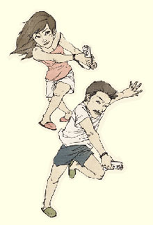 외모 주말에만 얼굴을 볼 수 있는 그들은 시장표 야구모자에 청바지 차림으로 함께 외출한다. 남편은 두툼한 콧수염을 기른 훤칠한 사람이었고 부인은 미인은 아니지만 글래머러스한 매력녀다. 행동 주말마다 전자제품 백화점에 가서 새로 나온 멀티미디어 제품을 구경한다. 멀티미디어 체험단에 참가, 얼리어답터로서 행복을 만끽한다. 그들은 밤마다 거실에서 테니스 게임에 열중하는데, 그 소음의 폐해가 말할 수 없이 끔찍하다. 대화 그들은 한 집에서도 각자 노트북을 갖고 놀며, 대화도 거의 공짜 문자 서비스를 이용한다. 멀티미디어야말로 부부에게 섹스 이상의 즐거움이며 놀이다. 그들은 아무런 운동도 하지 않는다. 그에게 발생할 것 같은 극적 사건 결국 주택 구입에 실패, 평생 집세를 내며 살게 되는 주거 환경, 또는 3년 뒤 부부 비만으로 삶의 모든 활력이 사라지는 불행. 그들은 내 집 바로 위층에 사는데, 위(wii) 테니스를 즐기다 거실 바닥에 구멍을 낼 수도 있다. |