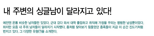 예전엔 온통 비슷한 남자들만 있었다. 군대 갔다 와서 대학 졸업하고 취직해 가정을 꾸리는 평범한 남성뿐이었다. 하지만 요즘 내 주위 남자들이 달라지기 시작했다. 좀처럼 찾아보기 힘들었던 종족들이 지금 이 순간 진드기처럼 번지고 있다. 그 다양한 유형(?)을 개한다.<br><br>[2008년 11월호]