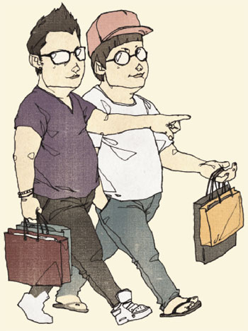그들의 과거 여럿이서 족발집에 간다거나, 감자탕을 먹으러 간다거나 하는 행위를 유달리 싫어했다. 다 먹은 후 거나하게 취해 노래방 가는 행위는 더 이해 못했다. 현재 그들의 상태 서로 알아보기까지 그리 오랜 시간이 걸리진 않았다. 쇼핑에 취미가 있다는 것을 알게 된 후, 바로 의기투합해버린 스타일. 그렇다고 게이는 아니다. 단지 취미가 잘 맞는 친구일 뿐. 혼자도 쇼핑을 하러 다니긴 하지만, 둘이 다닐 때 (자칫 어색할 수 있는) 단골이 아닌 집에도 들를 수 있다. 주로 검은 뿔테 선글라스와 스키니 진 팬츠를 즐겨 착용하며, 둘이 붙어 다니면 남들이 자주 쳐다본다. 그들의 미래 남들처럼 돈을 모으지 못했다. 여전히 쇼핑을 즐기나, 예전 그 친구(쇼핑을 함께하던)와는 자주 만나진 못한다. 요즘엔 근사한 수트와 넥타이에 필이 꽂혔다. |