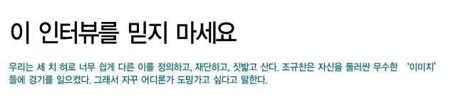 조규찬을 싫어하는 사람들은 주로 남자예요. 조규찬이 뭔가 재수 없는 모범생 이미지라고 생각하죠. 한마디도 지지 않고, 또박또박 자기 의견을 말할 것 같은. 자아가 강한 남자는 남자들 세계에서는 쉽게 인정받지 못하잖아요. 한국 남자들은 위계질서 시스템에 너무 익숙해져 있으니까.