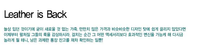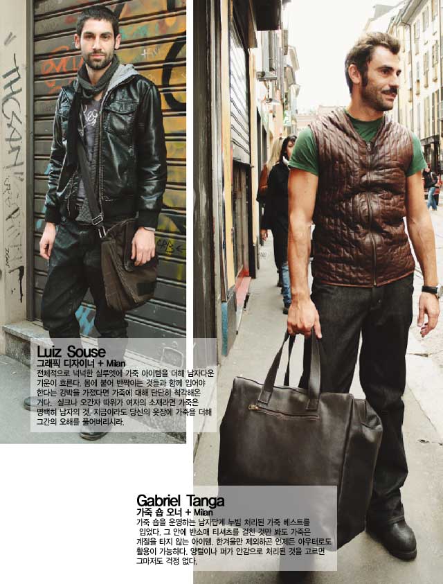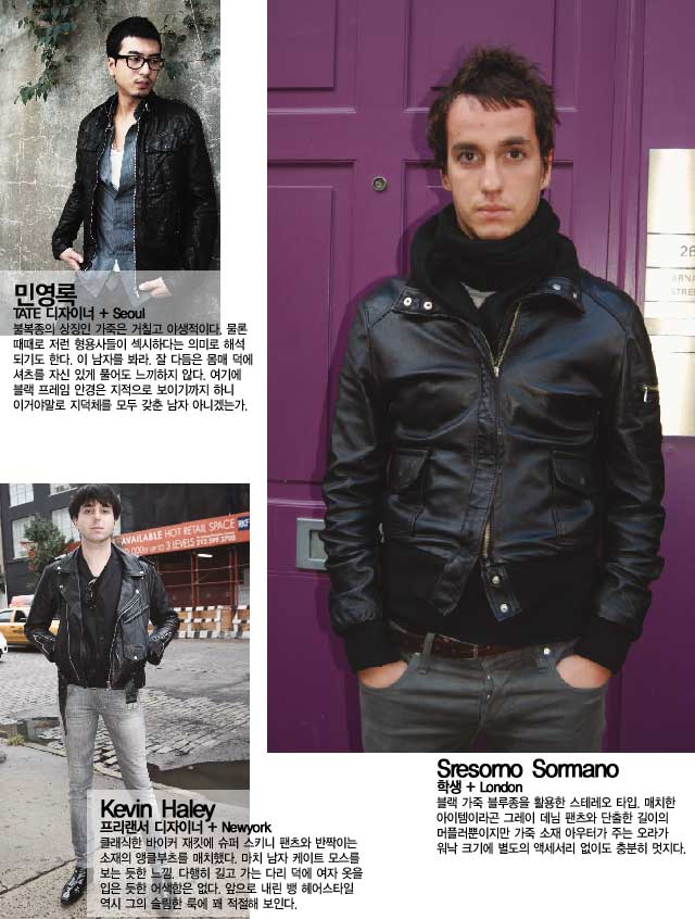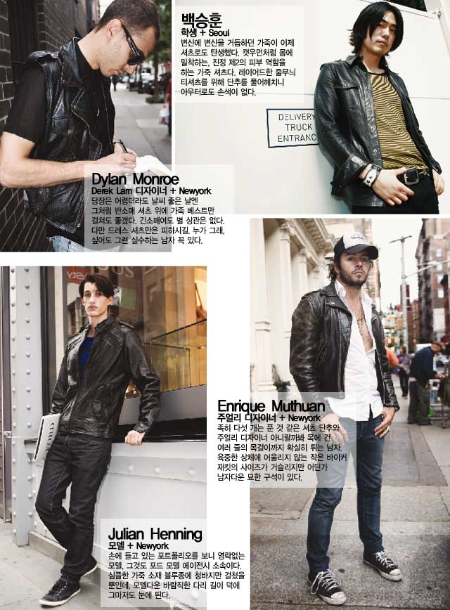 늘상 입던 것이기에 굳이 새로울 것 없는 가죽. 만만치 않은 가격과 비슷비슷한 디자인 탓에 쉽게 끌리지 않았다면 이제부터 펼쳐질 그들의 룩을 감상하시라. 걸치는 순간 그 어떤 액세서리보다 효과적인 변신을 가능케 해 다시금 놀라게 될 테니, 남은 과제란 통장 잔고를 재차 확인하는 일뿐!<br><br>[2008년 11월호]