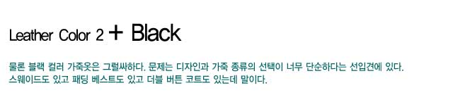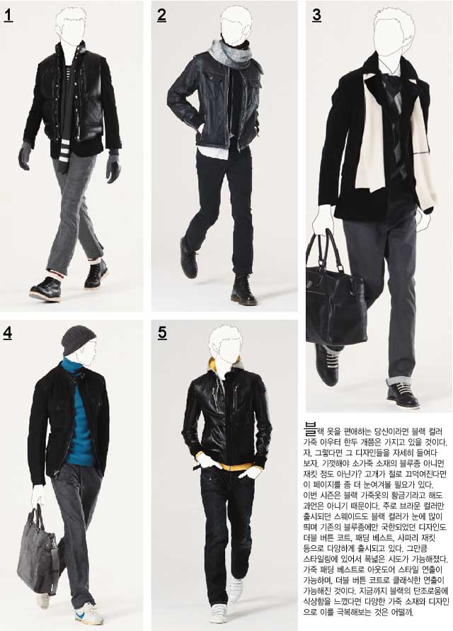 물론 블랙 컬러 가죽옷은 그럴싸하다. 문제는 디자인과 가죽 종류의 선택이 너무 단순하다는 선입견에 있다. 스웨이드도 있고 패딩 베스트도 있고 더블 버튼 코트도 있는데 말이다.<br><br>[2008년 11월호]