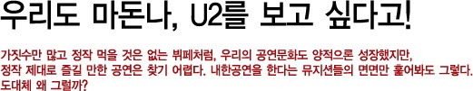 낮은 유료 관객 비율과 대중매체의 무관심, 여전히 부족한 인프라와 불필요한 경쟁 속에서 우리의 공연 시장은 암울했던 과거로 뒷걸음질을 칠 수도 있다. 지금 그나마 한국에서 볼 수 있는 양질의 공연조차 해외로 나가서 봐야 하는 상황이 벌어진다는 얘기다. 많은 이들이 내한공연을 열망하지만 한국을 찾아온 적이 없는 아티스트들은 말할 것도 없다. 이를테면, 전 세계에서 예매 전쟁, 심지어 폭동 사태까지 일으키고 있는 U2가 한국을 찾는 일이나, 공연 조건이 까다롭기로 유명한 키스 재릿이 한국에 오고 싶어 할 일은 앞으로도 당연히 없을 것이다.