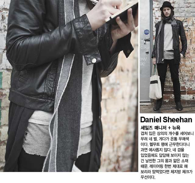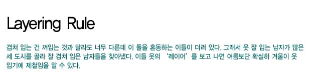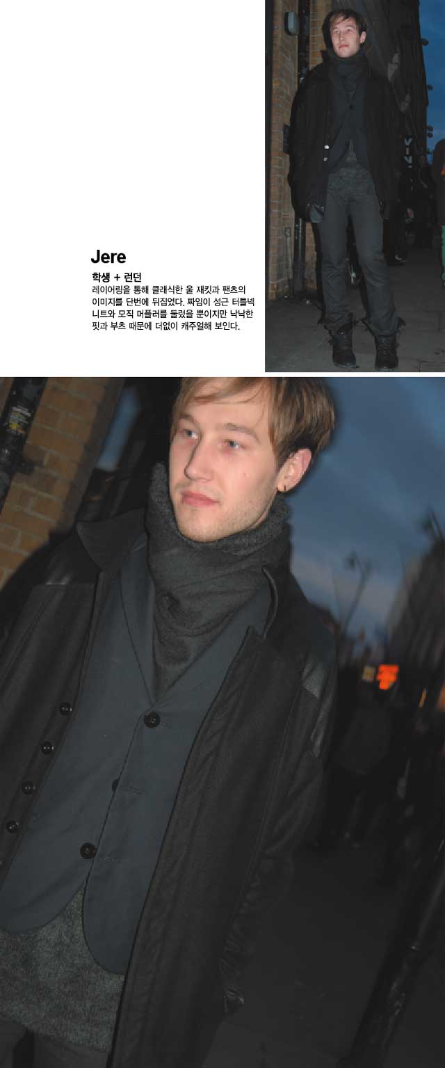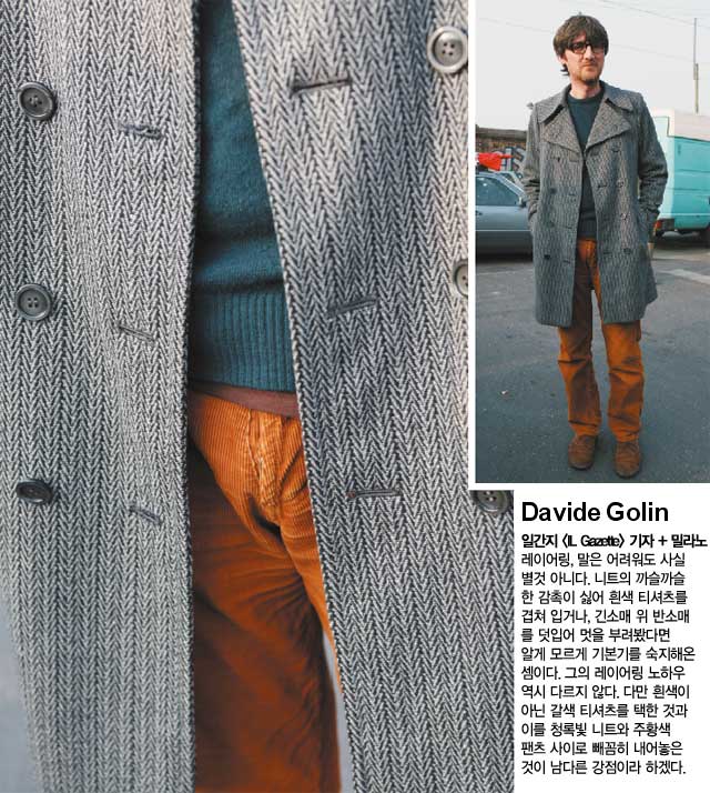 겹쳐 입는 건 껴입는 것과 달라도 너무 다른데 이 둘을 혼동하는 이들이 더러 있다. 그래서 옷 잘 입는 남자가 많은 세 도시를 골라 잘 겹쳐 입은 남자들을 찾아냈다. 이들 옷의 `레이어`를 보고 나면 여름보단 확실히 겨울이 옷 입기에 제철임을 알 수 있다.<br><br>[2008년 12월호]