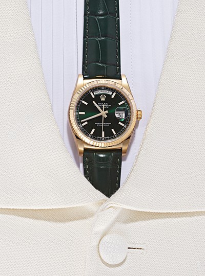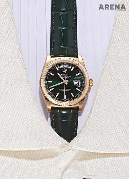 롤렉스의 상징적인 두 가지 색이 생생하게 쓰였다. 그린과 골드. 녹록지 않은 조합이긴 하나 롤렉스니까 납득 가능한 범위 안에 있달까. 불현듯 천박해지기 쉬운 가치들은 호사롭고도 우아한 방향으로 다뤄졌다. 36mm의 자그마한 케이스 덕분에 시계는 예상보다 담담하다. 은퇴한 프로 레슬러나 촐싹대는 래퍼로 보일 리 만무하다는 것. 가격미정. 흰색 턱시도 베스트 50만원·핀턱 셔츠 가격미정 모두 바톤 권오수 제품.