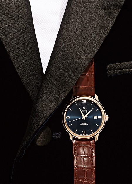 오메가식의 우아함을 논하자면 온전히 드 빌 프레스티지 컬렉션을 이야기해야 한다. 정직하게 동그란 케이스와 기교 없는 다이얼 디자인, 어쨌든 가장 기본적인 시계 형태를 정교하고 온순하게 매만진 흔적들이 보인다. 무슨 파란색일까, 쉽게 형언할 수 없는 파란색 다이얼에 레드 골드 케이스의 조합은 또 어찌나 고결한지. 1천1백만원대. 잉크색 벨벳 재킷 2백80만원 바톤 권오수, 턱시도 셔츠 가격미정 디올 옴므 제품.