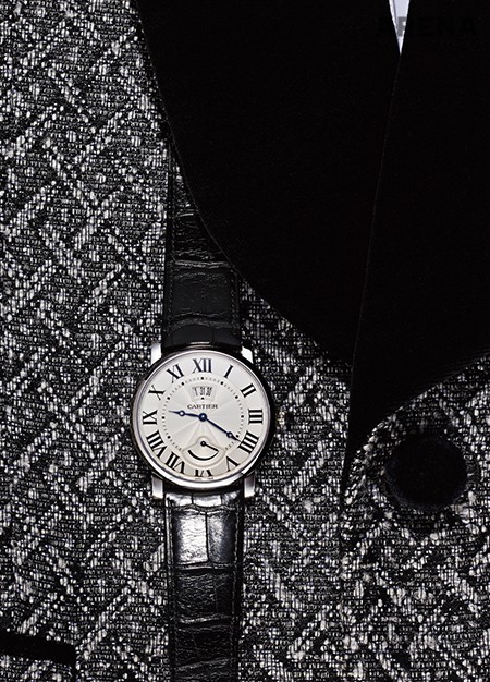 턱시도에 크고 복잡한 시계를 차는 것만큼 공해 같은 것도 없지만, 이 시계 정도의 컴플리케이션이라면 고개를 끄덕이고도 남는다. 12시 방향의 3중 날짜창, 6시 방향의 파워리저브 인디케이터, 시계의 맥락을 해치는 건 어디에도 없다. 오히려 비율적으로 훌륭해 보일 정도다. 시계 곳곳에서 풀풀 풍기는 ‘댄디함’에 대해선 두말할 것도 없고. 1천만원대. 숄칼라 자카르 재킷 2백90만원·핀턱 셔츠 가격미정 모두 바톤 권오수 제품.