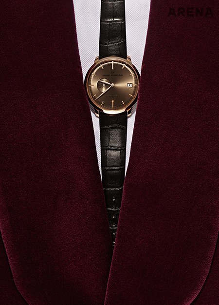 다이얼 색을 빼놓고 이 시계를 설명할 순 없을 것 같다. 시계에서 도통 보기 힘든 색, 갈색과 금색, 거기에 살짝 도는 붉은색. 지라드 페리고는 이 색을 코냑색으로 정했다. 다이얼의 선 브러시드 피니싱 덕분에 색은 더욱 찬연해졌다. 핑크 골드 케이스와의 조합도 퍽 훌륭하고, 매끈한 악어가죽 스트랩을 선택한 것도 탁월했다. 1천9백만원대. 포도주색 숄칼라 벨벳 재킷 2백90만원 바톤 권오수, 턱시도 셔츠 가격미정 디올 옴므 제품.
