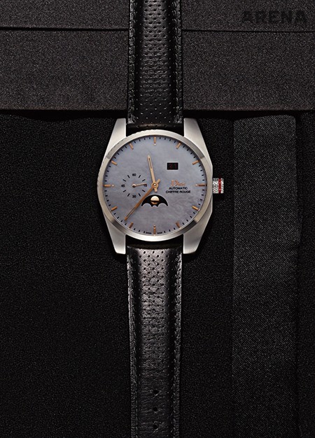 디자인적으로 할 말이 많은 시계다. 일단 저 다이얼의 선택. 메탈릭 그레이 자개를 온전한 다이얼로 쓴 기개라든지. 그것뿐일까. 뜻밖의 날짜창과 문페이즈, 다이얼과 우아하게 합을 이루는 골드 도금 세부들, 거기다 스포티한 시계에 주로 쓰이는 펀칭 가죽 스트랩 같은 것들이 훌륭하게 균형을 이루고 있다. 한마디로 도회적이고 드레시하다. 가격미정. 턱시도 팬츠 가격미정 생 로랑, 커머번드 가격미정 디올 옴므 제품.