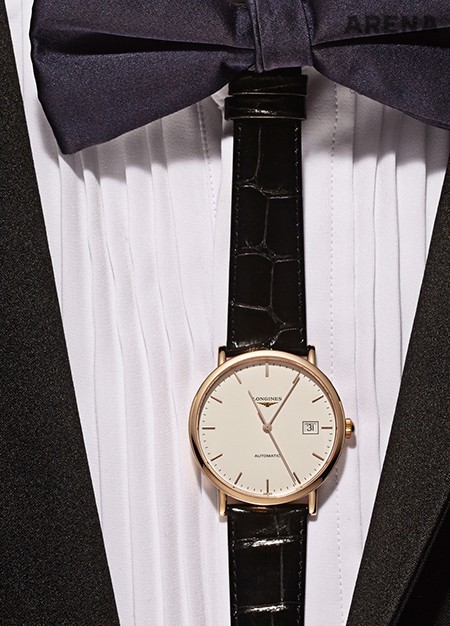 론진은 시작부터 우아함을 향했다. 모든 시계들은 줄곧 우아함과 맞물려왔고, 고전성을 이토록 따르는 브랜드는 드물었다. 그런 시계들 중에서도 가장 간명하게 우아함을 이야기하는 건 엘레강트 컬렉션이다. 완벽하게 절제된 뉘앙스의 디자인, 가뿐한 두께, 그리고 악어가죽 광택 스트랩은 우아함의 전형을 보여준다. 4백만원대. 검은색 베스트·남색 보타이 모두 가격미정 디올 옴므, 핀턱 셔츠 가격미정 바톤 권오수 제품.