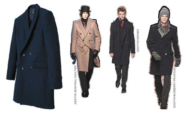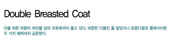 더블브레스트 재킷이 고루하다는 고정관념은 이미 깨졌다. 원 버튼과 투 버튼만을 반복하던 국내 수트 브랜드까지 이를 수용했으니 말이다. 하지만 더블브레스트 재킷을 젊고 감각적으로 입는 이를 찾아보기란 좀처럼 힘들다. 아직까지는 클래식한 이미지가 더 지배적이기 때문이다. 그에 반해 더블브레스트 코트는 조금 다르다. 우선 더블브레스트 재킷보다 버튼이 강조되지 않아 부담이 덜하다. 그리고 버튼을 채우면 허리 라인이 자연스럽게 들어가면서 근사한 A형 실루엣이 완성된다. 물론 버튼을 풀었을 때도 환상적이다. 이를 가장 잘 이용하는 디자이너로는 버버리 프로섬의 크리스토퍼 베일리를 들 수 있다. 그는 컬렉션에서 매번 다른 느낌의 더블브레스트 코트를 선보인다. 2007 F/W 컬렉션에선 넓은 칼라와 카키, 그레이 컬러를 사용하여 군복에서 느껴지는 남성다움을 표현했으며 2008 F/W 시즌에는 아티스트의 작품에서 영감을 받아 좀 더 독특한 소재로 로맨틱한 분위기를 자아냈다. 그밖에도 에르메스와 장 폴 고티에 등이 더블브레스트 코트에 남다른 애정을 보였다.
