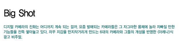 디지털 카메라의 진화는 어디까지 계속 되는 걸까. 요즘 발매되는 카메라들은 그 자그마한 몸체에 놀라 자빠질 만한 기능들을 잔뜩 쌓아놓고 있다. 자꾸 지갑을 만지작거리게 만드는6대의 카메라와 그들의 개성을 반영한 <아레나>식 광고 비주얼.<br><br>[2009년 1월호]