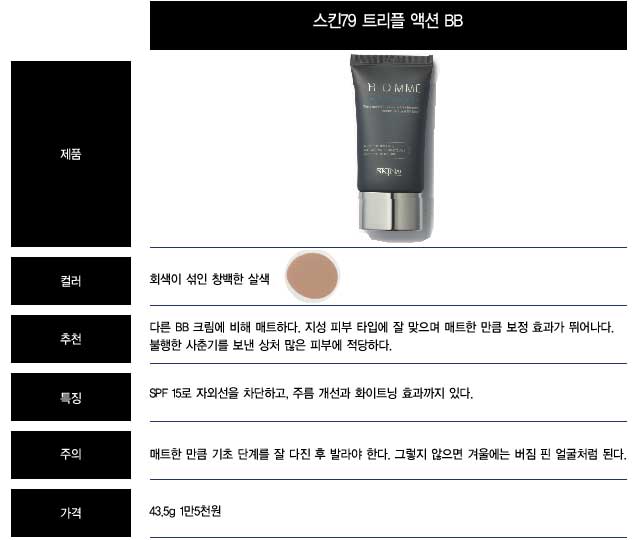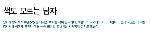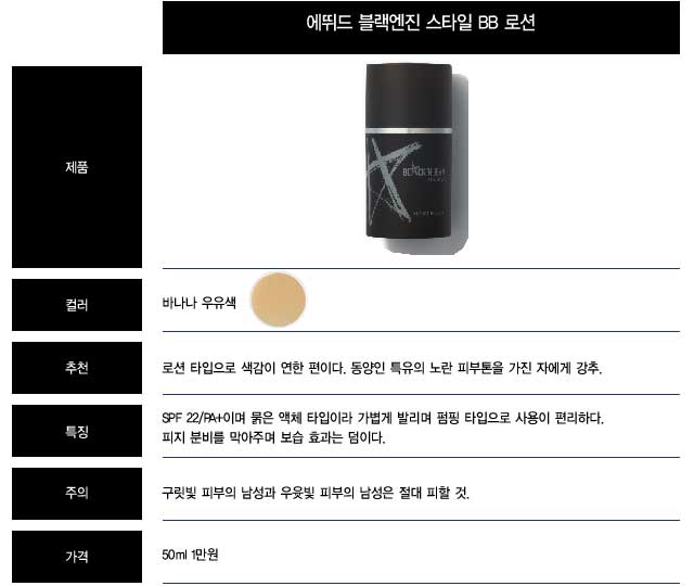 아침에 지하철에서 이런 남자를 만나면 그야말로 ‘애 떨어질 뻔’하는 아찔한 경험을 하게 된다. 콩고물을 묻혀놓은 듯 허연 얼굴, 목과 투 톤을 이루는 정확한 경계선. 이 남자가 어떤 피부 질환을 앓고 있는 게 아닐까 의심스러운 허연 얼굴 말이다. 문제는 그런 남자들이 대부분 아침에 급하게 비비 크림이나 컬러 로션을 바르느라 제대로 두드리거나 문지르는 행위를 못한 바쁜 현대인이라는 거다.