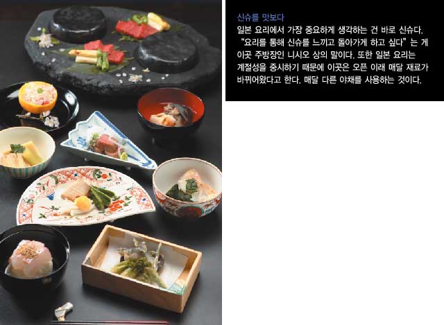 “오늘 저녁은 가이세키 정식 코스입니다. 기모노로 갈아입고 나오십시오.” 그러니까 나는 정말로 산신령 같은 체험을 하고 있는 중이었다. 게다까지 갖춰 신고서, 가이세키를 맛보러 가는 길은 앞이 보이지 않았으니 말이다. 깜깜했고, 조용했고, 입을 벌리면 차가운 입김만이 느껴질 뿐이었다. 여긴 분명 ‘깊은 산골 옹달샘’ 근처가 아닐까. 도시와 동떨어진 곳에서 느끼는 감정은 이렇게 색다르기만 했다. 식사 후 몸을 담갔던 온천물은 그다지 뜨겁지 않았다. 워워 소리를 낼 정도로 뜨끈한 탕에 익숙해 있던 나는 의아해서 물었다. “물이 왜 이리 미지근하죠?” 무조건 뜨거워야만 직성이 풀리는 내 성격과는 달리, 이곳의 온천물은 ‘오랜 시간 명상을 할 수 있게끔’ 미지근한 것이라 했다. 생각해보니 정말 그랬다. 기껏해야 탕 속에서 10분을 못 넘기는 내가 근 30분을 보낼 수 있었다. 이내 몸이 노곤노곤해져왔다.