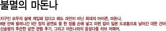 비틀스보다 더 많은 차트 1위곡과 앨범 판매량을 기록한 역대 최고의 가수 마돈나. 지난 5월 마돈나의 일본 공연 확정 소식을 접한 후 9월 20일 도쿄돔에서 마돈나를 직접 만나기로 결심한 내 마음속엔 서늘하지만 어찌할 수 없는 끈끈함 같은 게 있었다. 그건 나와 동시대를 살고 있는 모든 이가 공감할 수 있는 무엇 때문일 것이다. 그녀의 모습과 그녀의 음악 그리고 그녀의 삶은 크든 작든 지금 이 세상을 사는 모든 지구인의 인생에 소중하게 개입돼 있다. 사실, 지난해 11월에 발매된 최신 앨범