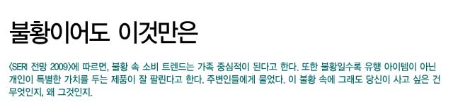 <SERI 전망 2009>에 따르면, 불황 속 소비 트렌드는 가족 중심적이 된다고 한다. 또한 불황일수록 유행 아이템이 아닌 개인이 특별한 가치를 두는 제품이 잘 팔린다고 한다. 주변인들에게 물었다. 이 불황 속에 그래도 당신이 사고 싶은 건 무엇인지, 왜 그것인지.<br><br>[2009년 2월호]