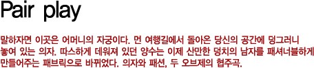 말하자면 이곳은 어머니의 자궁이다. 먼 여행길에서 돌아온 당신의 공간에 덩그러니 놓여 있는 의자. 따스하게 데워져 있던 양수는 이제 산만한 덩치의 남자를 패셔너블하게 만들어주는 패브릭으로 바뀌었다. 의자와 패션, 두 오브제의 협주곡.<br><br>[2006년 11월호]