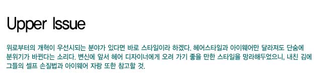 위로부터의 개혁이 우선시되는 분야가 있다면 바로 스타일이라 하겠다. 헤어스타일과 아이웨어만 달라져도 단숨에 분위기가 바뀐다는 소리다. 변신에 앞서 헤어 디자이너에게 오려 가기 좋을 만한 스타일을 망라해두었으니, 내친 김에 그들의 셀프 손질법과 아이웨어 자랑 또한 참고할 것.<br><br>[2009년 2월호]
