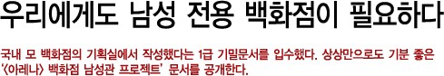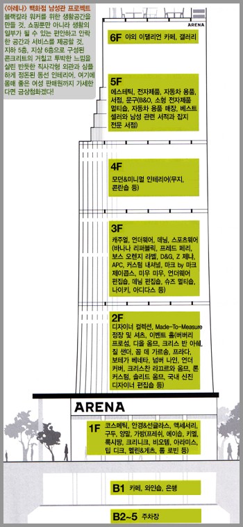국내 모 백화점의 기획실에서 작성했다는 1급 기밀문서를 입수했다. 상상만으로도 기분 좋은 `<아레나> 백화점 남성관 프로젝트` 문서를 공개한다.<br><br>[2006년 11월호]