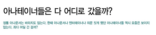 정통 아나운서는 바라지도 않는다. 한때 아나운서냐 엔터테이너냐 의문 짓게 했던 아나테이너들 역시 요즘은 보이지 않는다. 죄다 어딜 간 걸까? <br><br>[2009년 3월호]