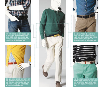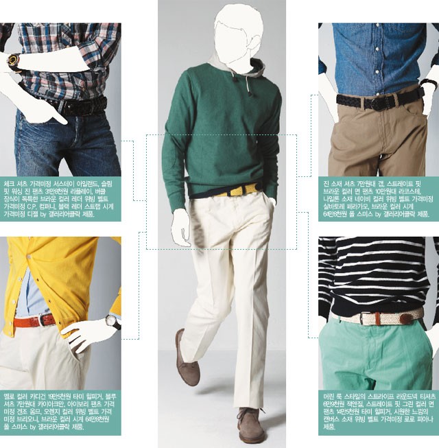 할리우드 패셔니스타나 옷 잘 입는 마른 모델들을 보면 벨트가 드러나는 스타일링을 하는 경우가 많다. 하지만 일반인이 벨트가 보이게 하려면 땅에 떨어진 동전을 줍기 위해 허리를 숙이거나 형광등 갈 때 정도밖에 없을 것이다. 그렇다고 해서 벨트에 신경을 쓰지 말라는 얘기는 아니다. 기본적인 구색만 좀 갖추자는 거다. 블랙 구두에 흰 양말을 신을 수 없는 것처럼 말이다. 그래서 <아레나>가 정의한 벨트 개수는 3개 정도다. 블랙과 브라운은 두말할 것도 없고 거기에 한 가지 더 추가한 것이 바로 위빙 벨트다. 사실 위빙 벨트는 소재의 특성상 봄과 여름에 제격이라고 할 수 있다. 블랙과 브라운으로 가볍고 시원한 느낌의 의상을 커버하기엔 너무 답답한 느낌이 들기 때문이다. 그래서 요즘 같은 계절에 위빙 벨트는 쇼핑 목록 1순위라고 하겠다.