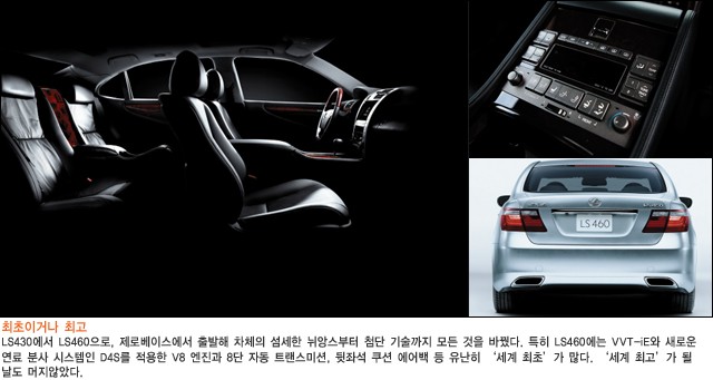 시동은 스위치만 누르면 된다. 물론 아이들링 때 별 미동이 없다. 마침내 운전석에 앉았지만, 안전을 거듭 강조한 시승 코스는 필요 이상의 속도를 낼 빌미를 쉽게 내주지 않았다. 6400rpm에서 최고 출력 380마력, 4100rpm에서 최대 토크 51kg·m을 내는 V8 4.6ℓDOHC 엔진과 8단 자동 트랜스미션의 궁합은 잘 맞는 편이다. 튀어나가는 느낌은 덜하지만, 크게 서운하진 않다. 스프린터보다는 무난하게 스타트한 뒤 서서히 토크와 속도를 올리는 200m 주자를 떠올리면 된다. 이 엔진에는 전기 모터를 이용해 흡기 밸브 타이밍을 조절하는(역시 세계 최초!) VVT-iE가 있다. 여기에 실린더 직분사와 포트 분사를 겸하는 D4S 시스템을 갖췄다. 공회전 때는 실린더 분사, 흡기 때는 포트 분사, 압축 때는 직접 분사 등 연료 뿜는 곳을 상황에 맞게 바꿔준다. 렉서스의 발표에 따르면, 그 결과 엔진 출력은 7%, 토크는 7.5%가 향상되었다. 8단으로 승단한 만큼 기어비도 더 촘촘해졌다. 따라서 변속 반응도 부드럽고 연비 효율성도 더 개선되었다. 스티어링은 좀 더 민감한 쪽으로 수정되었다. 10가지 기능이 통합된 VDIM(차체역학 통합제어 시스템)이 이끄는 제동력은 완벽에 가깝다. 전자식 파킹 브레이크는 자동 설정이 가능하고, 브레이크 홀드 기능도 신호가 많은 상습 정체 구역에서 요긴하게 쓸 수 있다. LS460은 수치상으로도 S클래스와 7시리즈, A8에 필적하거나 그들을 능가한다. 0→100km/h 가속 시간은 5.7초로 메르세데스 벤츠 S500L과 BMW 750i 사이에 위치하고 연비는 8.8km/ℓ로 BMW 750i와 아우디 4.2 콰트로를 능가한다. 조금 아쉬웠던 크기도 렉서스 최초의 롱 휠베이스 버전으로 만회했다. LS460L의 휠베이스는 3090mm로 BMW 750Li LWB와 아우디 A8 4.2 콰트로 LWB 중간 정도다.