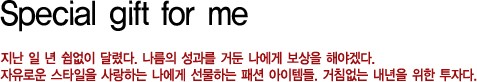 지난 일 년 쉼없이 달렸다. 나름의 성과를 거둔 나에게보상을 해야겠다. 자유로운 스타일을 사랑하는나에게 선물하는 패션 아이템들. 거침없는 내년을 위한 투자다.<br><br>[2006년 12월호]