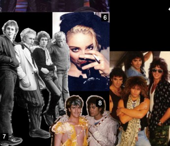 | 1 1980년대 올드스쿨 힙합 스타일을 끌어낸 말콤 맥라렌. 2 Zoot Suit로 대표되는 스타일을 추구한 키드 크레올. 3, 5 록뮤직계의 ‘꽃미남’들로 뉴 로맨티시즘의 대표주자, 듀란듀란. 4, 6 과장되고 섹시한 글램 룩을 선보인 마돈나. 7 영국 펑크록에 결정적인 역할을 한 펑크 스타일의 섹스 피스톨스. 8 넓은 어깨를 강조한 재킷으로 유명한 마이클 잭슨. 9 록그룹 특유의 슬리브리스와 슬림 팬츠의 매칭을 즐겨 한 본 조비. |
