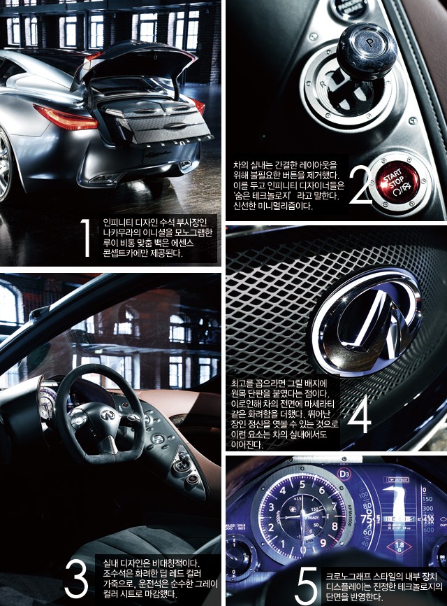 MX-5는 86만5천 대의 판매고를 올리면서 대박을 냈다. 혼다의 스포츠카들은 케이트 모스의 연애보다 더 역동적으로 오르고 내리기를 반복했지만 내내 꽤 높은 자리를 차지했다. 렉서스는 뛰어난 엔지니어링과 만족도에서 꾸준히 높은 점수를 얻으며 럭셔리 자동차로 42만 대를 판매하며 성공적인 지위를 따냈다. 그렇다면 인피니티는? 인피니티는 같은 시기에 16만 대 판매되었는데 대부분 미국에서 올린 실적이다. 현재 인피니티는 유럽에까지 쇼룸을 확장했다. BMW의 침체로 공황 상태가 우려되는 지금, 타이밍이 이보다 더 나쁠 순 없다. 하지만 인피니티는 경제가 상승기로 접어들고, 깨끗한 파워트레인이란 날개를 달기만 한다면(그리고 새로운 모델들로 연속 안타를 친다면) 제대로 자리 잡을 거라고 단언하고 있다. “유럽의 고급 시장에서 경쟁하는 것은 매우 어렵습니다.” 나카무라는 말한다. “독일, 영국, 그리고 이탈리아 브랜드가 워낙 막강하기 때문에 위치를 확고히 하는 게 쉽지는 않습니다. 하지만 우리가 생산한 차들은 일본적인 대안에 가깝습니다. 닛산의 GT-R은 포르쉐나 페라리 혹은 애스턴 마틴과 전혀 닮지 않았지만, 성능 면에선 아주 뛰어납니다. 그리고 닛산 콰자나는 콘셉트카와 매우 비슷한 스타일의 자동차를 양산할 겁니다. 미래의 닛산은 새로운 아이디어와 혁신적인 스타일로 자동차 시장에 도전장을 낼 것입니다.” 믿음직하게 들린다. 그렇지만 고급 시장에는 또 다른 난제가 있다. “인피니티의 경우 우리는 다른 유럽 프리미엄 자동차들과 완전히 다른 외형의 차들을 생산할 수 없습니다. 에센스는 애스턴이나 마세라티의 외형과 그리 다르지 않지만 괜찮습니다. 우리는 아름다운 디자인에서 멀어지길 원하지 않으니까요. 어떤 점에서 우리는 독일과 영국, 그리고 이탈리아 브랜드들의 외형을 좀 더 세련되게 다듬을 작정입니다. 그렇지만 전체 콘셉트 면에서 볼 때, 그러니까 디자인과 주행, 그리고 테크놀로지를 합쳐보면 우리는 그들과 매우 다릅니다.” 그의 이 간결한 설명은, 에센스가 유럽의 취향을 그대로 살린 나카무라 시대의 첫 자동차임을 잘 말해주고 있다. 독창성이 부족하다는 점이 실망스러울 수도 있지만, 미래의 인피니티가 마세라티처럼, 그리고 혼다 하이브리드의 기민함, 토요타의 기술, BMW의 경쾌함, 명민함과 더불어 위풍당당한 모습을 보여준다면, 그 누가 불평할 수 있겠는가?