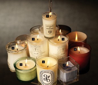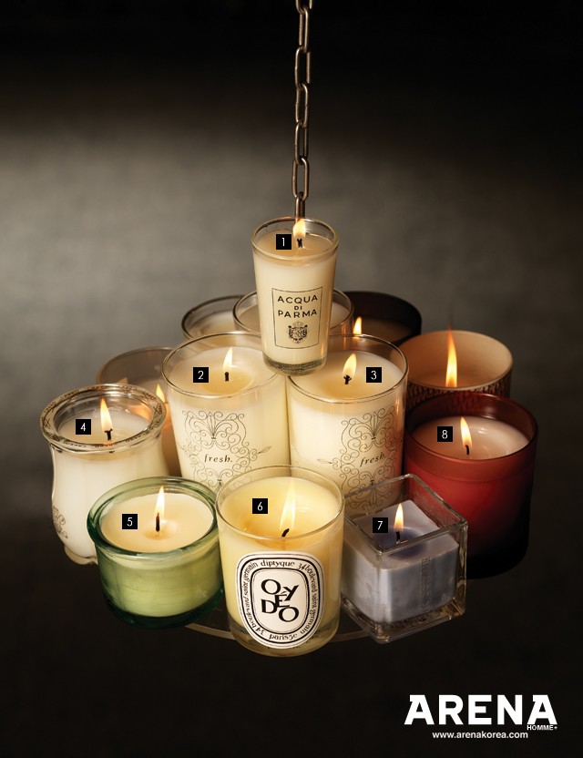 | 1 반짝이는 사틴 마감 유리컵을 사용했으며 이탈리아의 클래식하고 우아한 향을 선사한다. 퍼퓸 캔들 콜로니아 65g, 4개 11만원 아쿠아 드 파르마 제품. 2 리치와 망고의 풍부한 과즙 향과 따뜻한 앰버 향이 이국적인 느낌. 슈거 리찌 캔들 215g 8만3천원 프레쉬 제품. 3 샌달우드 향이 마음에 안정감을 주고 숙면을 도와 준다. 씨드롱 드 빈 캔들 215g 8만3천원 프레쉬 제품. 4 고급스러운 금색 뚜껑과 앤티크한 사틴 마감 유리컵이 인테리어 소품으로 활용하기에 제격이다. 60시간 사용 가능. 실버 마운틴 워터 캔들 200g 12만5천원 크리드 제품. 5 100% 식물성 아로마 성분을 함유해 두통이나 목감기 치료에 효과가 있다. 라반두 플랜트 퓨어 폼 캔들 110g 3만2천원 아베다 제품. 6 일본의 유자와 자몽 그리고 꽃으로 구성된 향으로 스트레스를 해소해 편안함을 선사한다. 오에도 190g 7만8천원 딥티크 제품. 7 은은한 라벤더 향이 오랜 시간 유지되며 낭만적이면서 평온한 분위기를 연출해준다. 라벤더 캔들 100g 3만3천원 록시땅 제품. 8 상큼한 꽃 향으로 소규모 파티나 축하 자리에 잘 어울린다. 칠드 상그리아 210g 3만7천원 바나나 리퍼블릭 제품. |