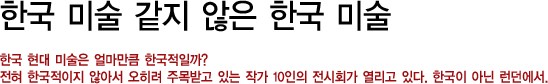 한국 현대 미술은 얼마만큼 한국적일까? 전혀 한국적이지 않아서 오히려 주목받고 있는 작가 10인의 전시회가 열리고 있다. 한국이 아닌 런던에서.