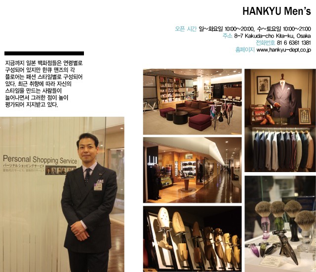 오사카의 쇼핑지 중 하나인 우메다 지역의 랜드마크라고 할 수 있는 HEP(Hankyu Entertainment Park). HEP는 ‘HEP FIVE’와 ‘HEP NAVIO’로 나뉘는데 HEP NAVIO의 지하 1층~지상 5층에 한큐 맨즈가 있다. 플로어 구성의 커다란 특징은 지금까지와는 다르게 연령별이 아니라 스타일별로 나뉘어 있다는 점이다. 지하 1층(Contemporary Style/ Men’s Beauty)에선 버버리 블랙 라벨, 폴 스미스 컬렉션, C.P. 컴퍼니 등과 속옷, 양말, 나이트 웨어, 시계 등 캐주얼한 소품류를 판매한다. 1층(Accessories) 정문 주변에는 루이 비통과 함께 불가리, 티파니 등의 러그 주얼리 매장이 있다. 전체관 중 소품 매장으로서 어느 플로어의 스타일에나 잘 맞는 셔츠와 넥타이, 슈즈, 벨트, 백, 여행 용품 등의 잡화 매장이다. 루이 비통 매장은 세계 최초로 맨즈 카테고리만 특화한 곳으로 백화점 내에서 가장 큰 규모다. 또한 2층(International Style)에는 프라다, 발렌시아가, 디젤, 꼼 데 가르송 등의 브랜드가 입점해 있으며 특히 일본의 인기 스타일리스트인 노구치 츠요시가 프로듀스한 셀렉트숍, 가라주 D.EDIT가 인기다. 3층(Gentlemen’s Style)에는 랄프 로렌, 조르지오 아르마니 등의 브랜드 외에 톰 포드 매장이 일본에서 최초로 오픈해 있다. 4층(Authenic Style)에는 아쿠아스큐텀, 브룩스 브라더스, 버버리, 닥스 등의 브랜드와 남성 기모노 전문점인 긴자모도지가 입점해 있다. 5층(Cool Trend Style)은 니콜 클럽 포 맨, 래틀트랩 등 젊은 층에게 인기 있는 일본 브랜드가 있다. 5층에서는 오니케(일본에서 발생한 남성 스트리트 패션의 하나. 와일드한 캐주얼 스타일과 섹시한 스타일을 융합시킨 패션) 브랜드 중 하나인 버팔로밥스가 손님이 가장 많이 찾는 매장이다.