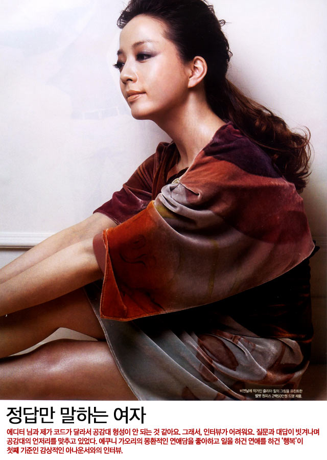에디터 님과 제가 코드가 달라서 공감대 형성이 안 되는 것 같아요. 그래서, 인터뷰가 어려워요. 질문과 대답이 빗겨나며 공감대의 언저리를 맞추고 있었다. 에쿠니 가오리의 몽환적인 연애담을 좋아하고 일을 하건 연애를 하건 `행복`이 첫째 기준인 감상적인 아나운서와의 인터뷰.
