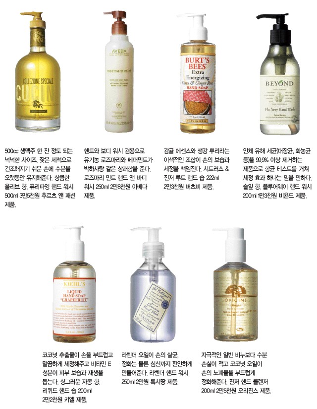 얼마 전부터 시내 버스엔 ‘손 씻기 생활화’란 문구가 요란스럽게 자리하고 있다. 신종플루 경계 경보가 우리를 은근히 압박하는 느낌이다. 어찌됐든 손 씻기 말고는 뾰족한 예방책도 없다니, 별 수 없다. 손이라도 잘 씻는 수밖에. 손에 있는 세균만 없애도 질병의 80%, 식중독의 90% 등 여러 가지 전염병을 예방할 수 있다지 않는가. 그렇다면 어떤 비누로 손을 씻어야 하나? 알려주겠다. 일반 비누로 손을 씻으면 세균이 비누에 잔류할 수 있으므로 반드시 펌프식으로 된 액체 타입 손 전용 비누를 사용하는 것이 좋다. 게다가 이 제품들은 자극적인 일반 비누보다 수분 손실이 적고 은은한 향이 오랜 시간 맴돌아 기분까지 맑아지는 효과까지 있다.