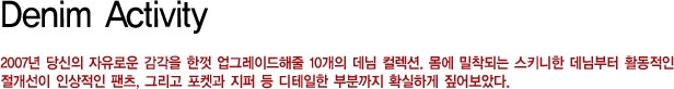 2007년 당신의 자유로운 감각을 한껏 업그레이드해줄 10개의 데님 컬렉션. 몸에 밀착되는 스키니한 데님부터 활동적인 절개선이 인상적인 팬츠, 그리고 포켓과 지퍼 등 디테일한 부분까지 확실하게 짚어보았다.<br><br>[2007년 2월호] Photography 우정훈 Editor 이현상 CREDIT INFOPhotography 우정훈 Editor 이현상