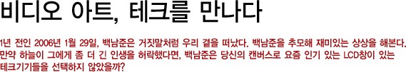 1년 전인 2006년 1월 29일, 백남준은 거짓말처럼 우리 곁을 떠났다. 백남준을 추모해 재미있는 상상을 해본다. 만약 하늘이 그에게 좀 더 긴 인생을 허락했다면, 백남준은 당신의 캔버스로 요즘 인기 있는 LCD창이 있는 테크기기들을 선택하지 않았을까?<br><br>[2007년 2월호]