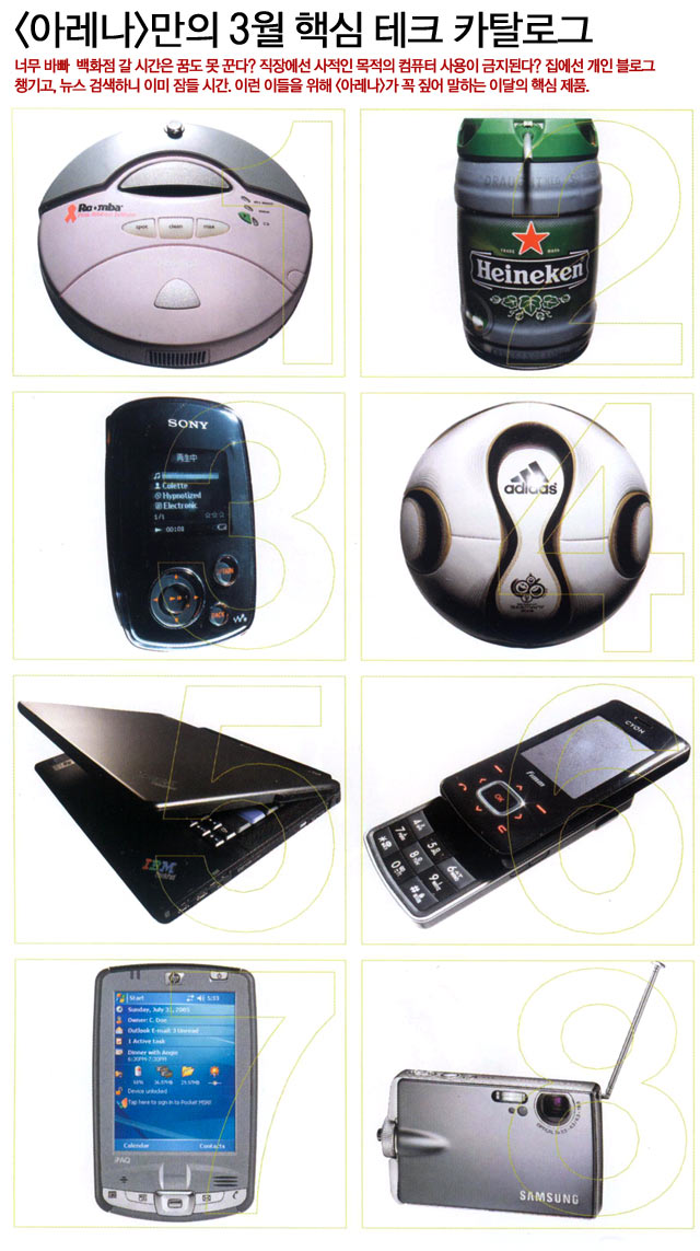 1 룸바의 핑크리본 리미티드 에디션 룸바의 핑크리본 리미티드 에디션이 주는 3가지 즐거움. 집안 곳곳을 돌아다니며 먼지를 빨아들이는 청결함은 기본이고, 핑크 컬러와 디자인은 디스플레이 용품으로도 손색없다. ‘한국유방재단’에 기부금이 적립됨으로써 유방암 환자를 돕는 색다른 만족감은 추가 보너스. 44만8천원. 2 하이네켄 5리터 히딩크의 나라 네덜란드에서 날아온 희소식 하나. 하이네켄 5리터가 새로 나왔다. 유럽에서 열리는 이번 월드컵 때 밤새우며 전·후반 90분을 버텨야 하는 축구팬에게 좋은 친구가 되어줄 듯. 5월에야 일반 매장에서 만나볼 수 있다. 가격미정. 3 소니 NW-A1000 소니의 적자답게 NW-A1000의 기능을 다 사용하려면, 밤새워 사용 설명서를 공부해야 한다. 그중에서도 가장 반가운 기능은 이 MP3를 떨어뜨릴 경우 스스로 중력 변화를 자동으로 감지해, 데이터를 보호하는 ‘지-센서’다. 덜렁거리는 성격의 소유자에게 제격이다. 당신이 좋아하는 음악을 최신곡 때문에 지우지 않아도 될 정도로 용량이 충분하다. 6GB. 31만9천원. 4 2006 독일 월드컵 공인구 팀 가이스트 이 ‘구’에는 철학이 있다. 인류가 가장 사랑하는 스포츠인 축구의 정수가 담긴 공이기 때문이다. 이 공의 향방에 따라 때로는 국가 간 전쟁도 일어났고, 살인도 저질러졌다. 또는 4년 전과 같이 온 국민이 하나가 되기도 했다. 이 공을 찬다고 해서 박지성이 되는 건 아니지만 서재 책상 장식용으로도 훌륭하다. 2006 독일 월드컵 공인구 팀 가이스트. 15만원. 5 IBM Z60T 그 기능이야 누구나 인정했지만, 어딘가 모르게 직육면체가 거슬렸던 IBM. 그 IBM의 블랙 이미지에서 탈피해 티타늄 실버의 새로운 디자인과 컬러를 도입한 ‘Z60T’. 책상에서나 볼 수 있는 IBM 노트북에서 벗어나, 일반 가정집의 예쁜 책상을 노리는 첫 번째 싱크패드의 공격 첨병. 2백만원대. 6 초콜렛 싸이월드 ‘도토리’가 세대를 가르는 단어인 적이 있었다. 이젠 자연스레 ‘싸이언의 초콜렛’이 그 자리를 차지했다. 화이트데이 때 여자친구가 “초콜릿 사줘!”라고 졸라댄다면 백화점의 식품 코너 대신 전자 용품 코너로 향할 것. 40만원대. 7 HP hx2790 공식적인 첫 미팅에서 당신의 전화기가 마치 몸을 떨 듯 계속 울려대도, 남들은 절대 당신을 프로라고 생각지 않는다. 일이 잘 안 풀릴 때 포켓 안쪽에서 살짝 HP의 hx2790을 꺼내보길. 클라이언트에게 확실한 이미지를 각인시킬 것이다. 70만원. 8 미니캣 포토 K50 / D512S 아무리 빅 백이 유행이라지만, 테크 제품은 손바닥만큼의 공간만 필요할 뿐이다. 미니캣 포토 K50 / D512S 하나에 디카, 디지털 캠코더, MP3, 이동식 디스크, 보이스 레코더, PC 카메라가 모두 들어 있다. 이것뿐이냐고? 비장의 무기 지상파 DMB TV가 어김없이 춘삼월 남심을 흔들 것이다. 59만9천원. |