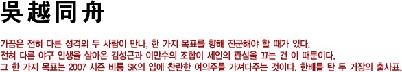 가끔은 전혀 다른 성격의 두 사람이 만나, 한 가지 목표를 향해 진군해야 할 때가 있다. 전혀 다른 야구 인생을 살아온 김성근과 이만수의 조합이 세인의 관심을 끄는 건 이 때문이다. 그 한 가지 목표는 2007 시즌 비룡 SK의 입에 찬란한 여의주를 가져다주는 것이다. 한배를 탄 두 거장의 출사표. <br><br>[2007년 2월호]