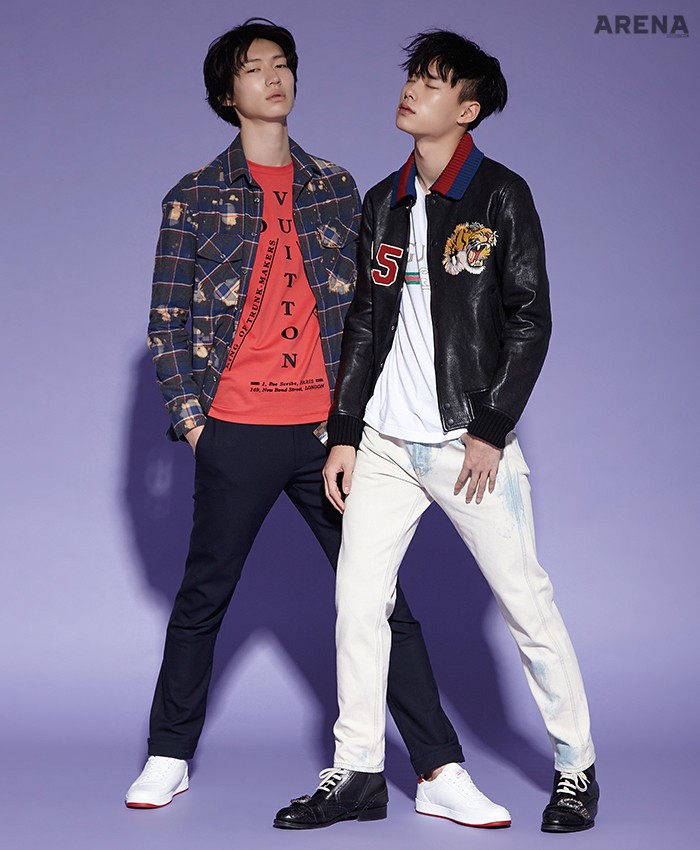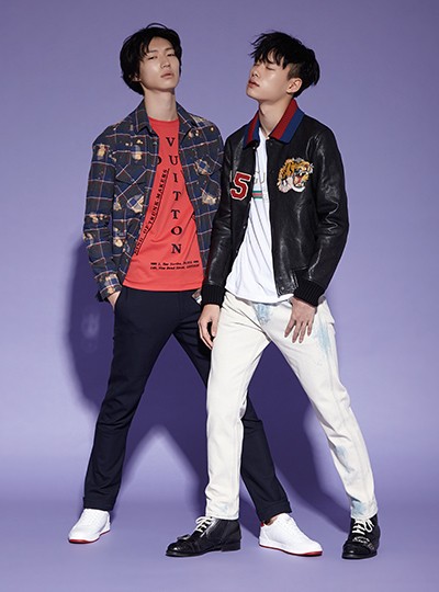 (오른쪽) 로고 프린트 티셔츠·데님 팬츠·자수 장식이 돋보이는 가죽 블루종·부츠·모두 가격미정 구찌 제품.