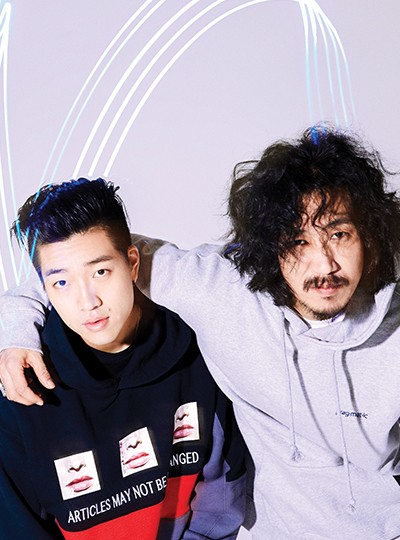 타이거 JK가 입은 그래픽 프린트 톱은 섭-에이지 by 헨즈 제품. 주노 플로가 입은 민트 컬러 후디는 오픈오드 by 헨즈 품.