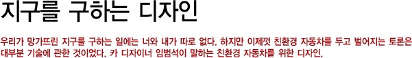 우리가 망가뜨린 지구를 구하는 일에는 너와 내가 따로 없다. 하지만 이제껏 친환경 자동차를 두고 벌어지는 토론은 대부분 기술에 관한 것이었다. 카 디자이너 임범석이 말하는 친환경 자동차를 위한 디자인.<br><br>[2007년 2월호]